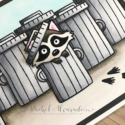 I used Copic Sketch Markers to color all of my images from the Robbie Raccoon Stamp Set and the background. I used the coordinating dies to cut out the front left raccoon and scissors to fussy cut the one inside the garbage can.
